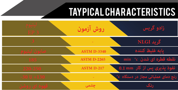 گریس زادو لیتیوم  EP3 متشکل از روغن پایه مرغوب با شاخص گرانروی بالا، تغلیظ کننده صابون لیتیم و مواد مخصوص جهت افزایش مقاومت در برابر فشار و بارهای مکانیکی وارده می باشد.